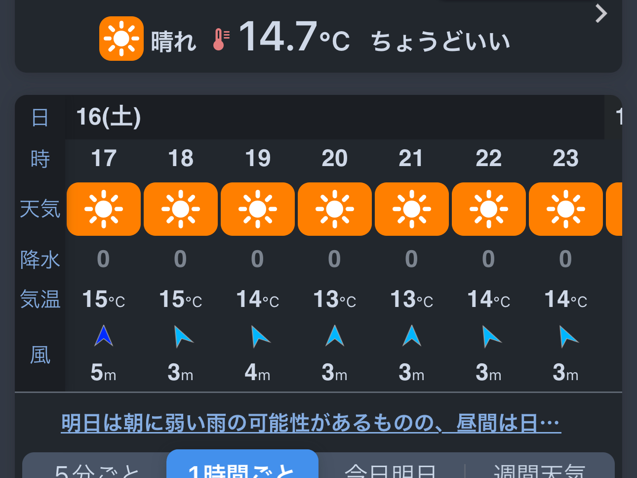 - 昼間は21℃ほど。上着のフードをやめたのだけども夜は少し涼しかった。