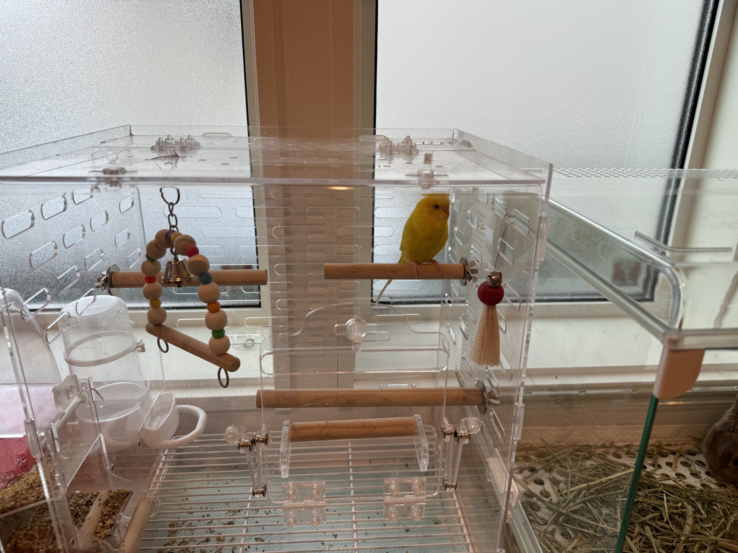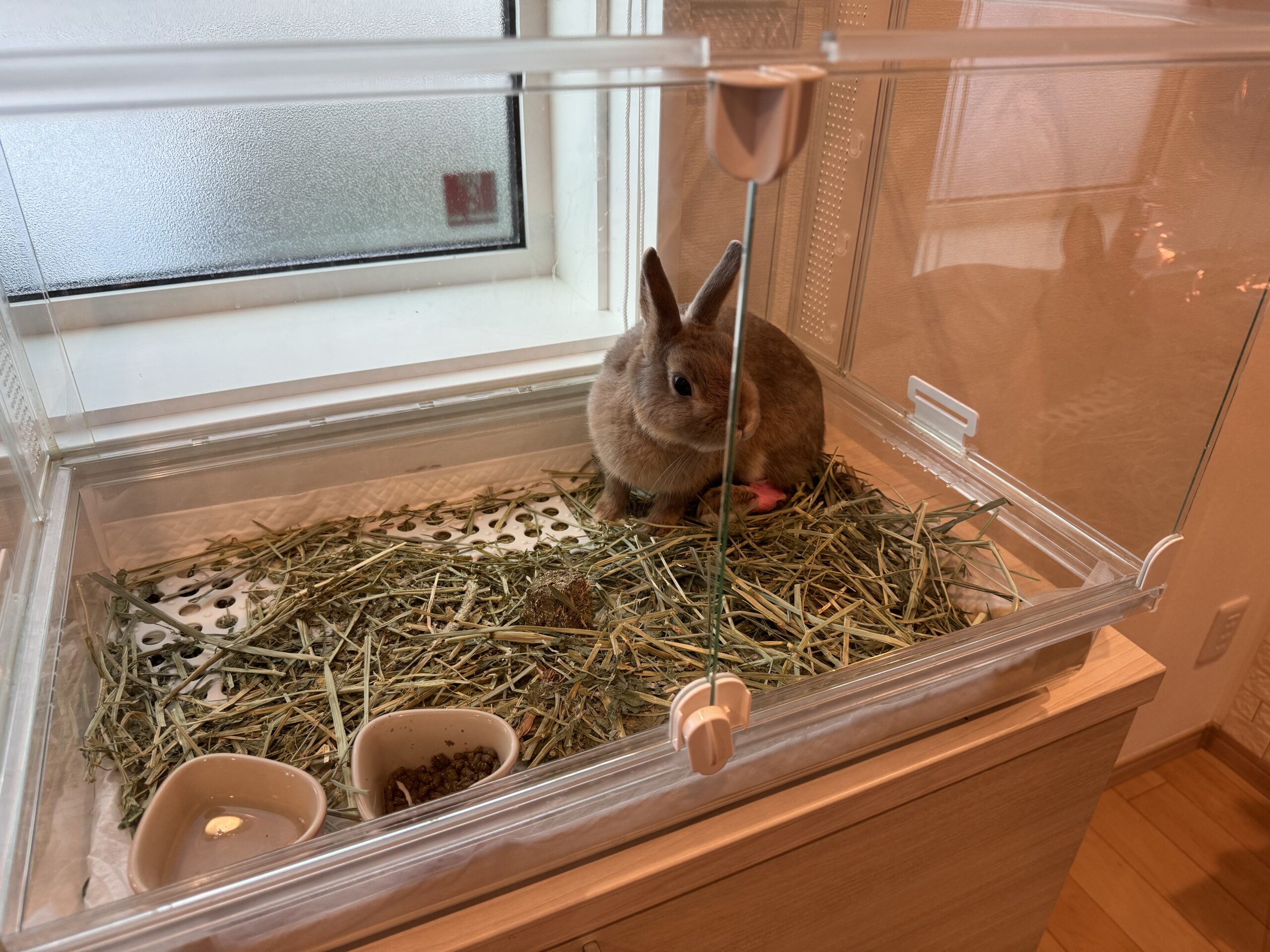 - 玄関にはペットのウサギとインコが。出迎えのバルーンも飾られていた。