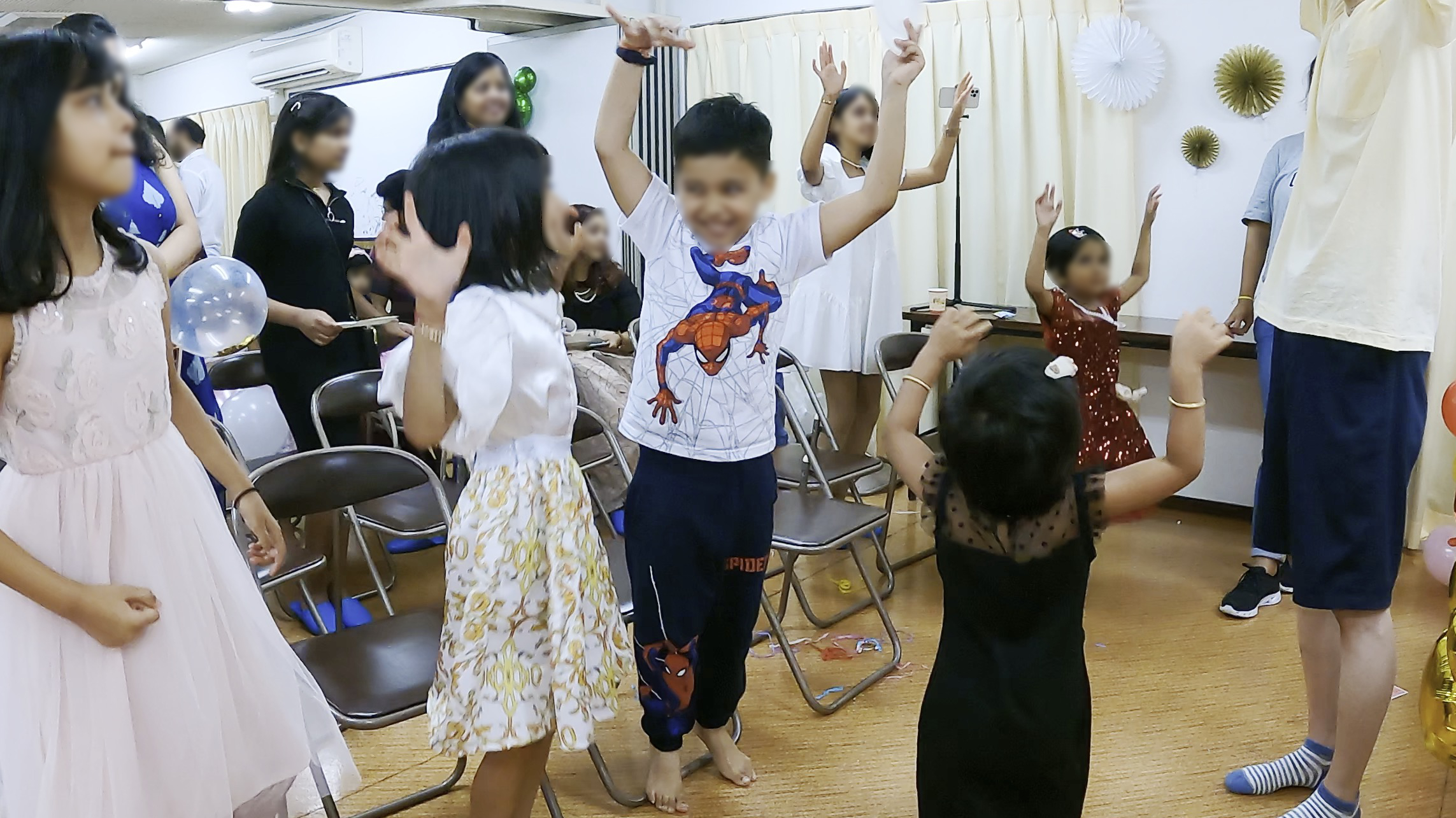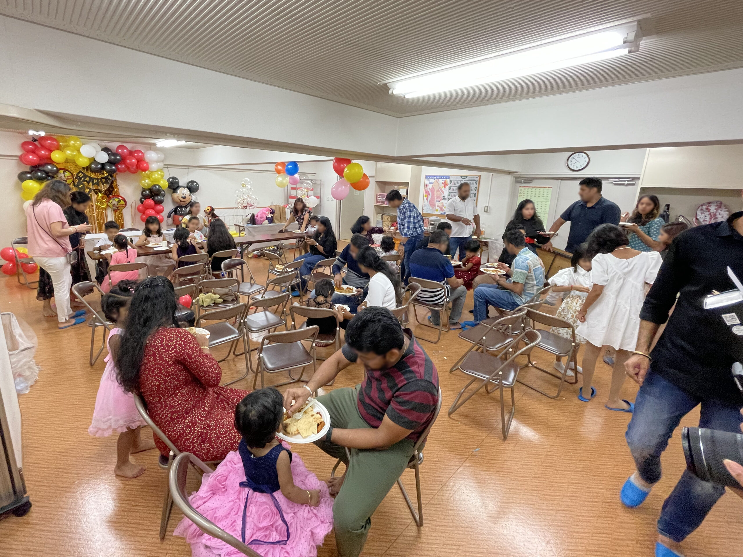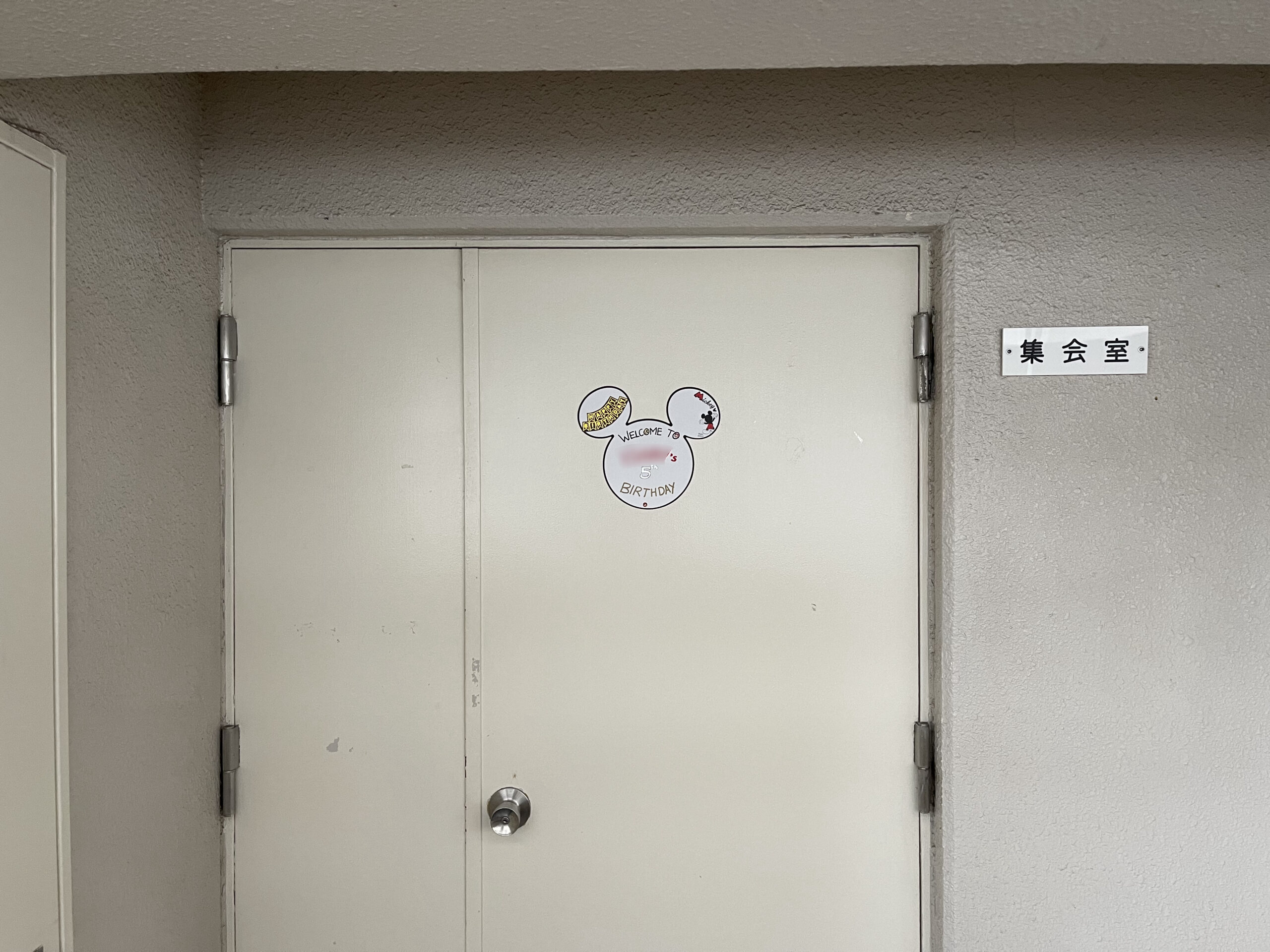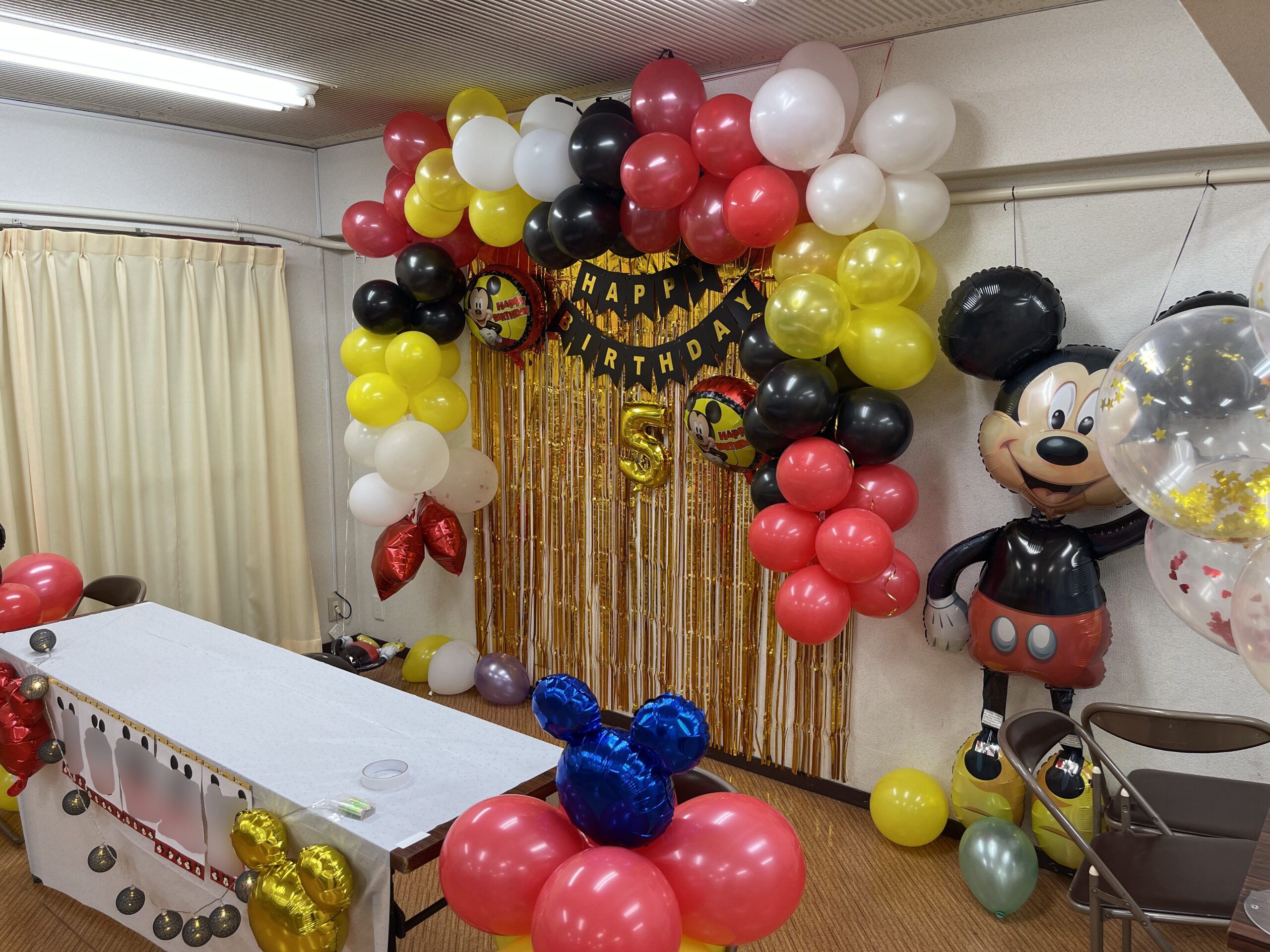 - 会場はマンションの集会室でミッキーのバルーンなどで飾り付けがされていた。