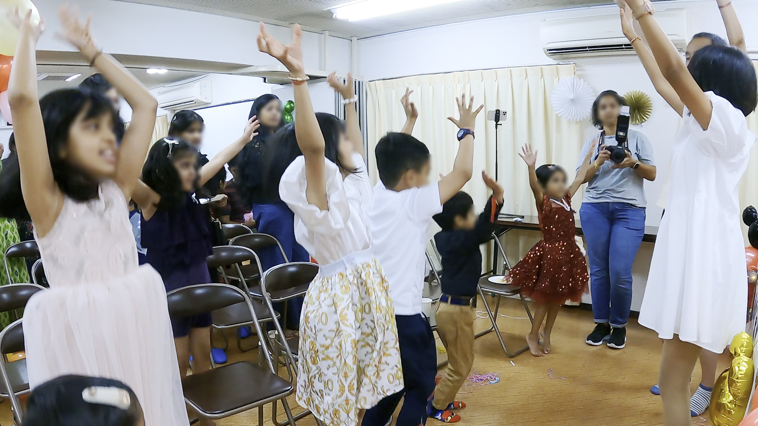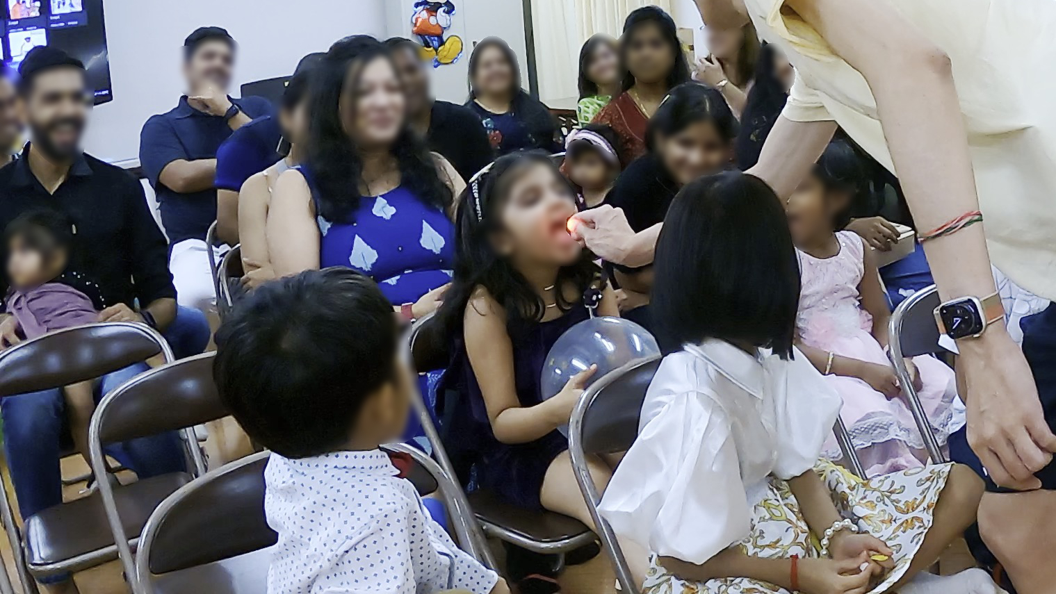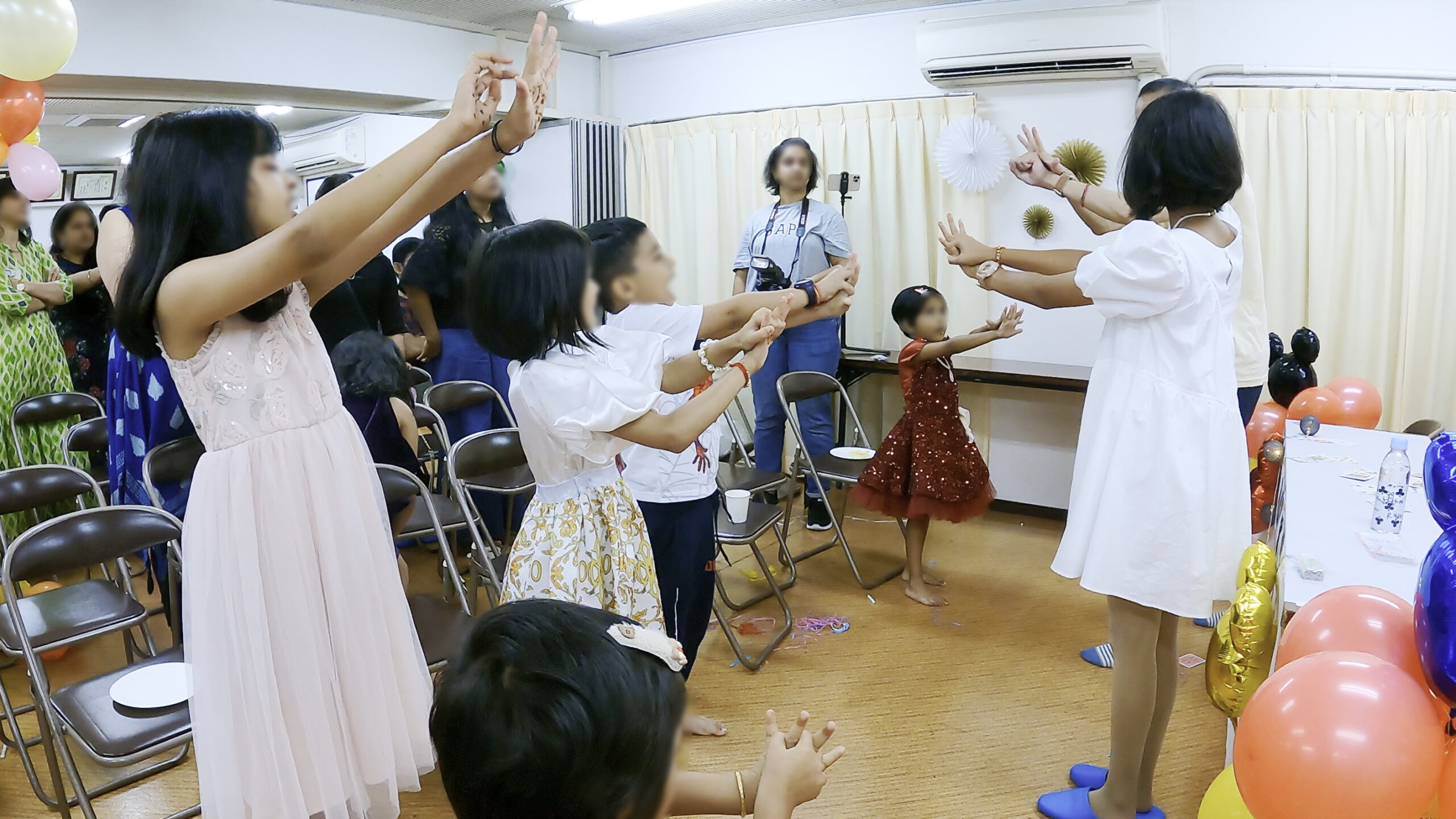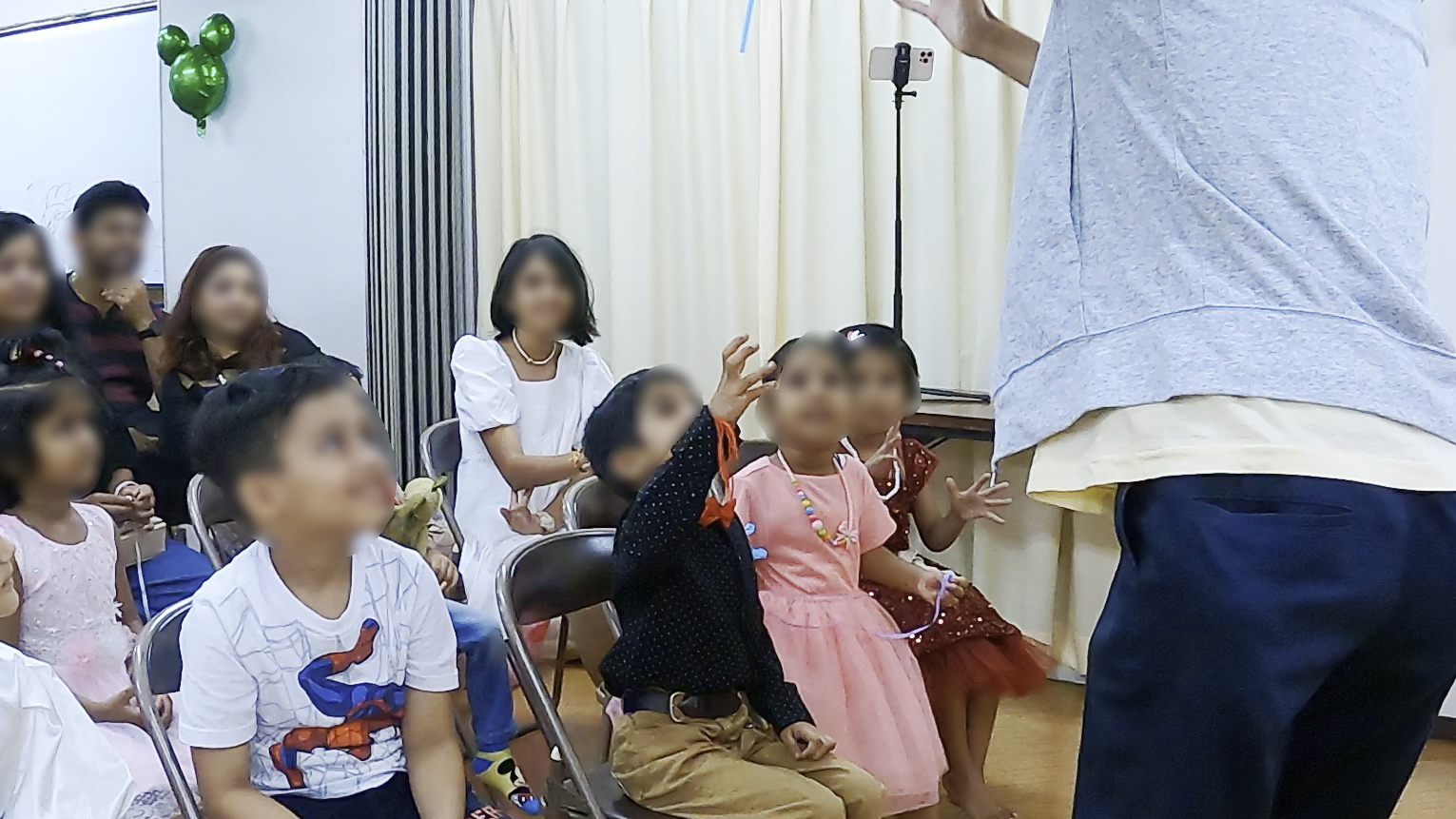 - 会場はマンションの集会室でミッキーのバルーンなどで飾り付けがされていた。