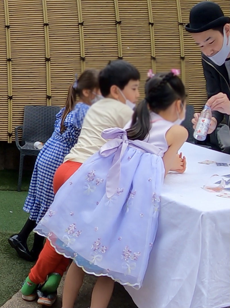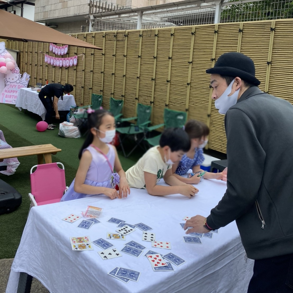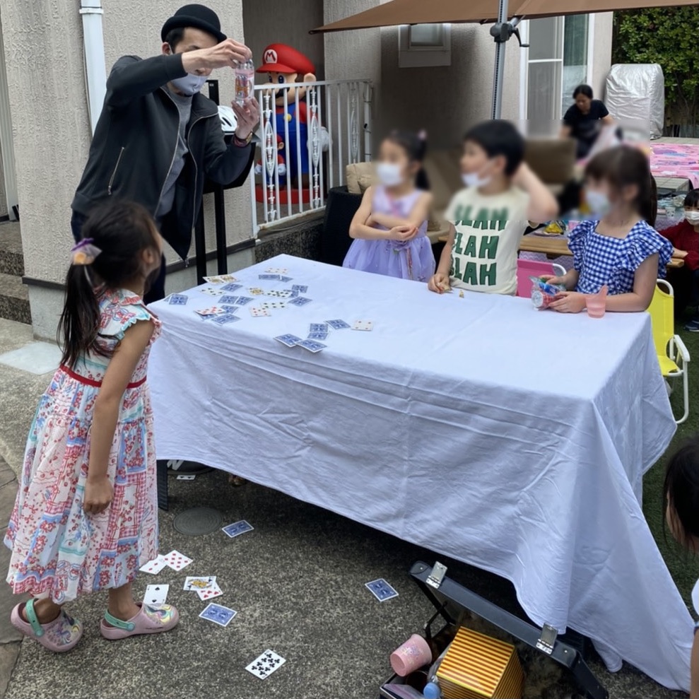 時間は1時過ぎから1時間。人数は17名でコロナ対策として換気のいい屋外、お庭でのマジックショーだった。