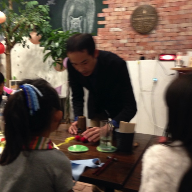 子供達のテーブルでマジックをやって後ろには親のテーブルがある。