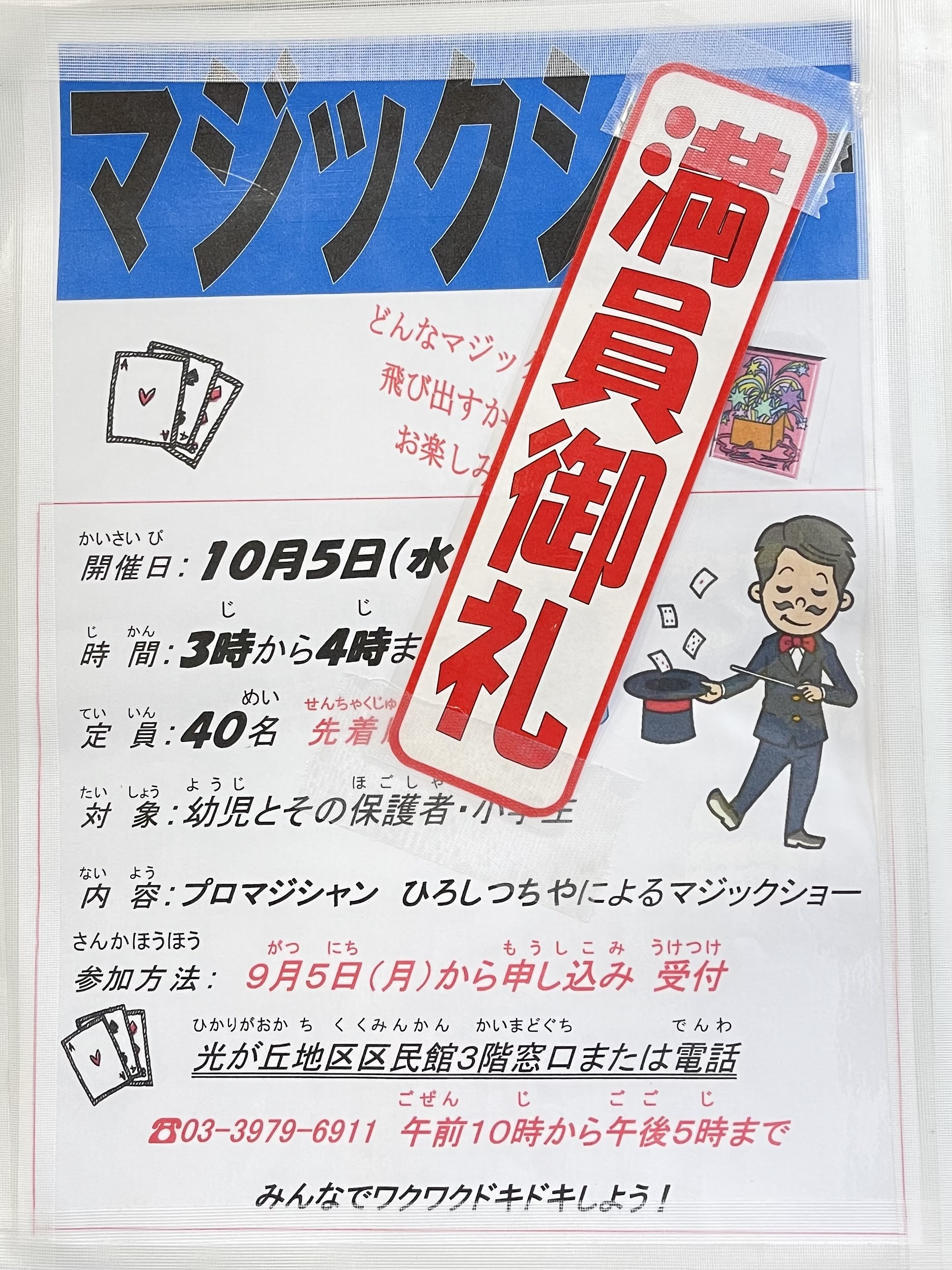 10/5(水)は練馬区光が丘地区区民館のイベントで子供向けのマジックショーだった。