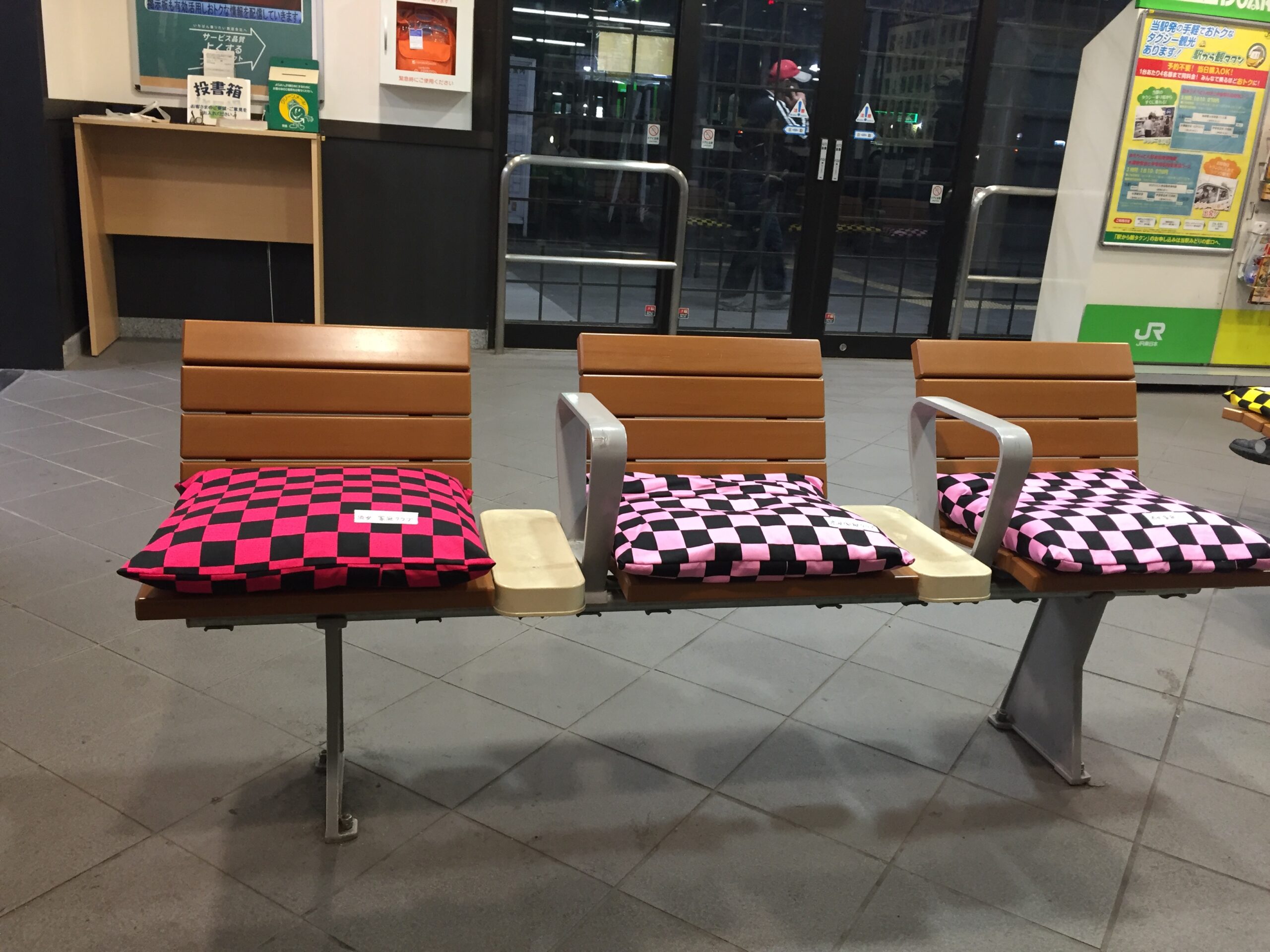 渋川駅の待合室。クッションがカラフル。帰りの吾妻線は本数が少なかったのでここで30分列車を待った。