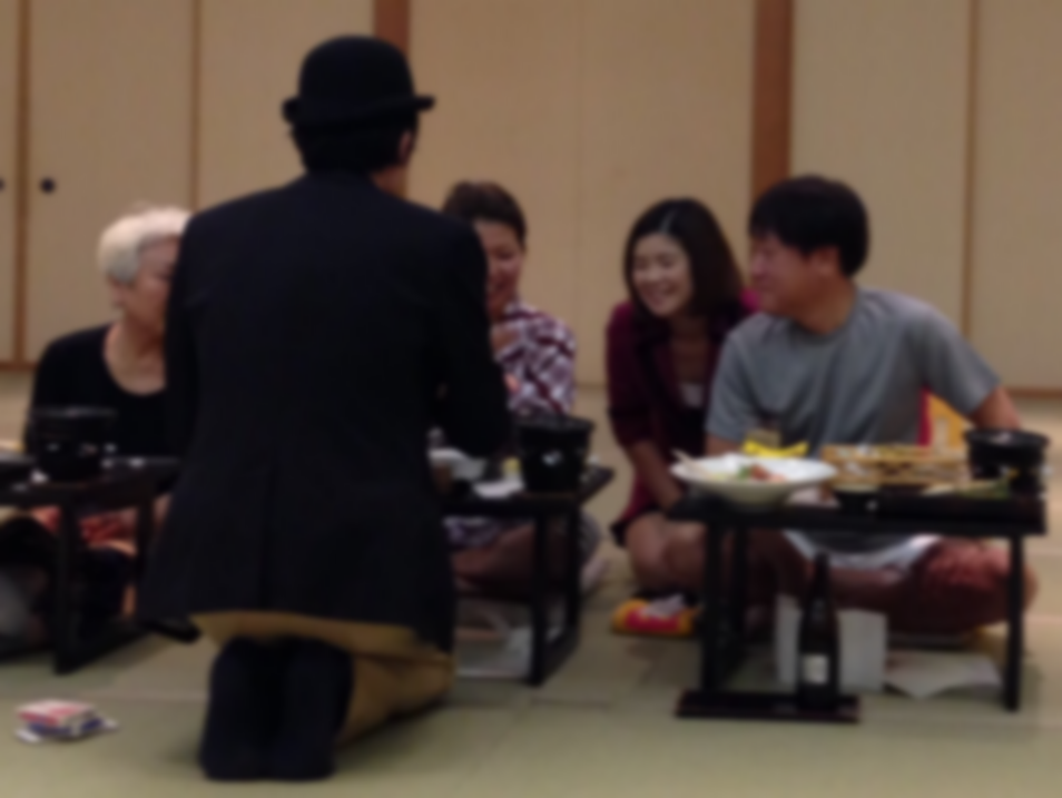 宴会場は結構広くお膳はコの字に並んでいてその前でマジック。何も無い紙袋から水の入ったグラスを出現させる。客からリクエストがあったので帽子をかぶっている。