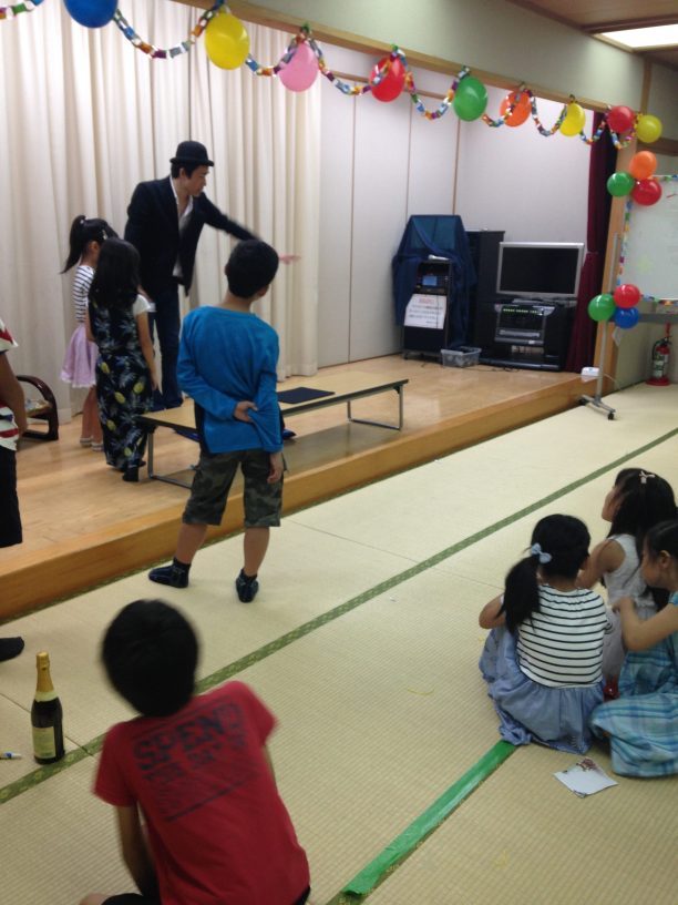 1枚目 子どもたちに前に来てもらって一緒にマジックをやった。