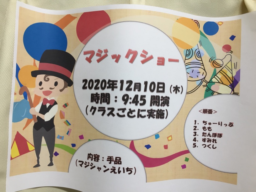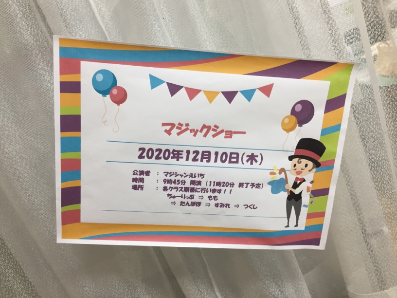 12月10日20年木曜日は東京都練馬区にある桜台保育園のお楽しみ会イベントで出張マジックショーだった。