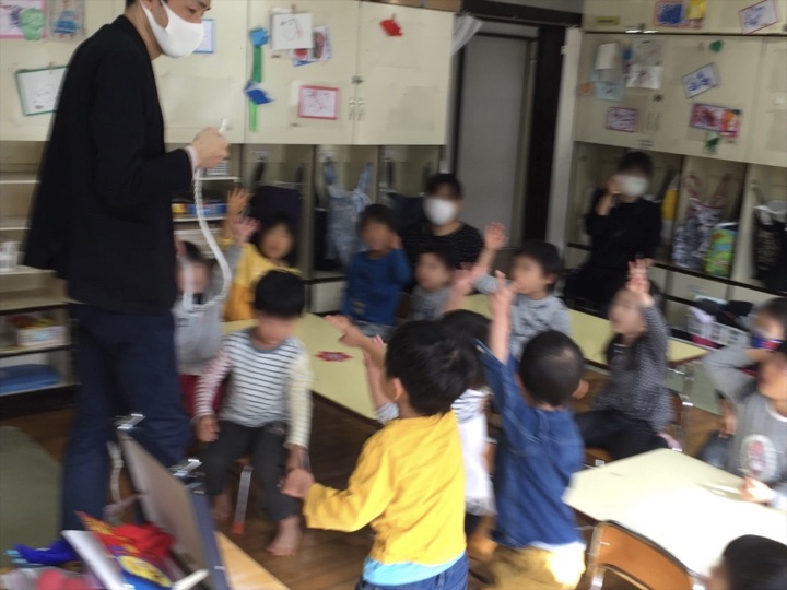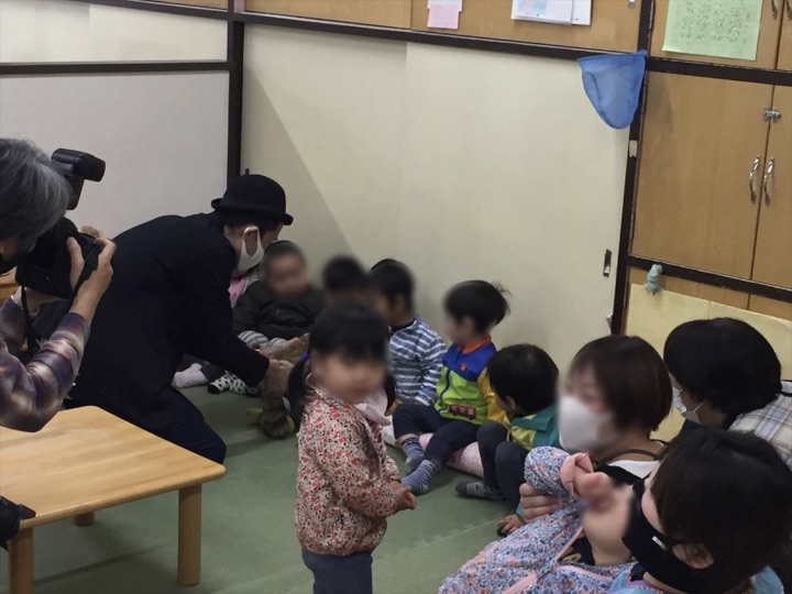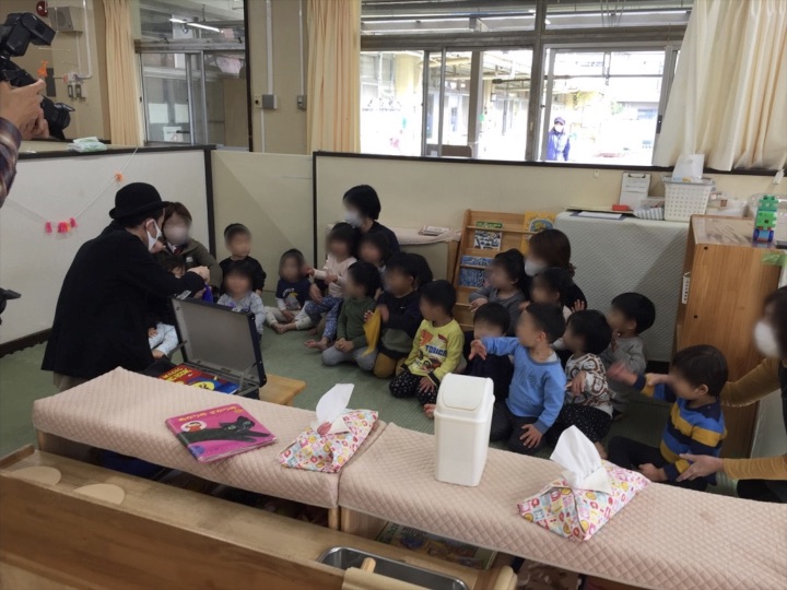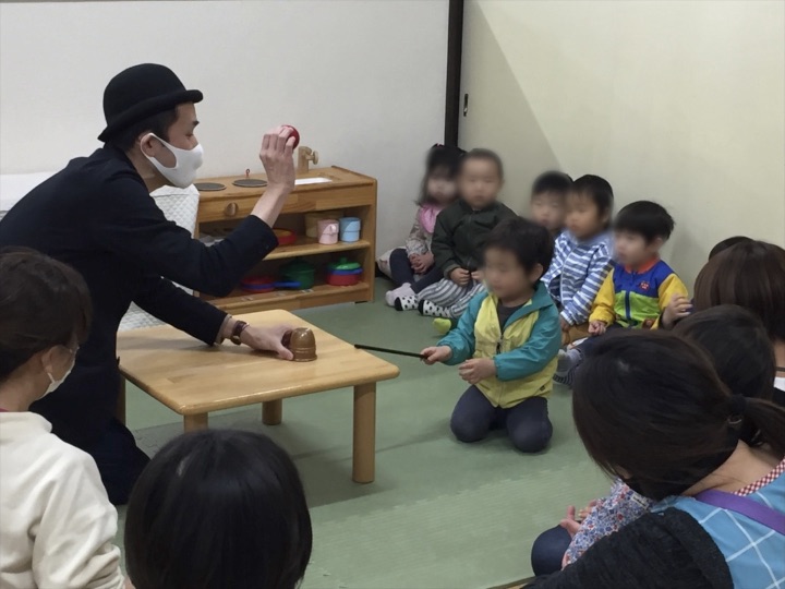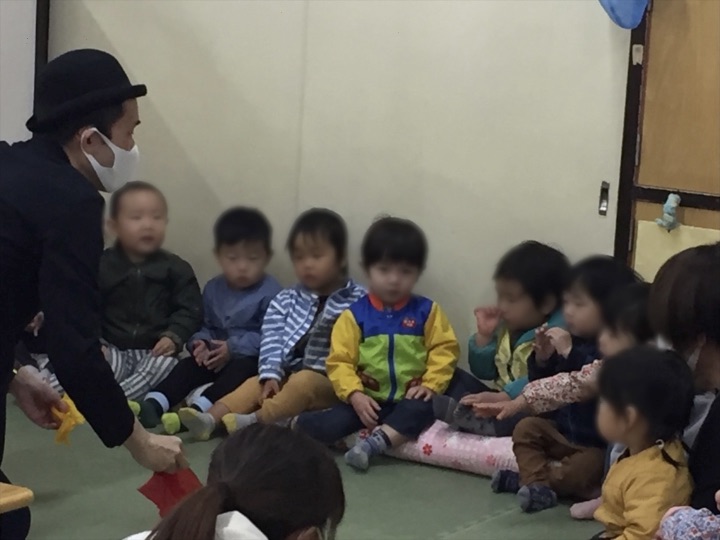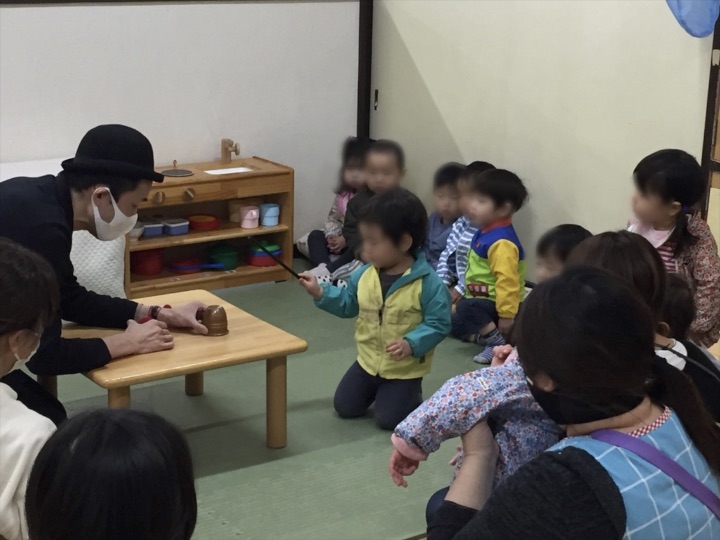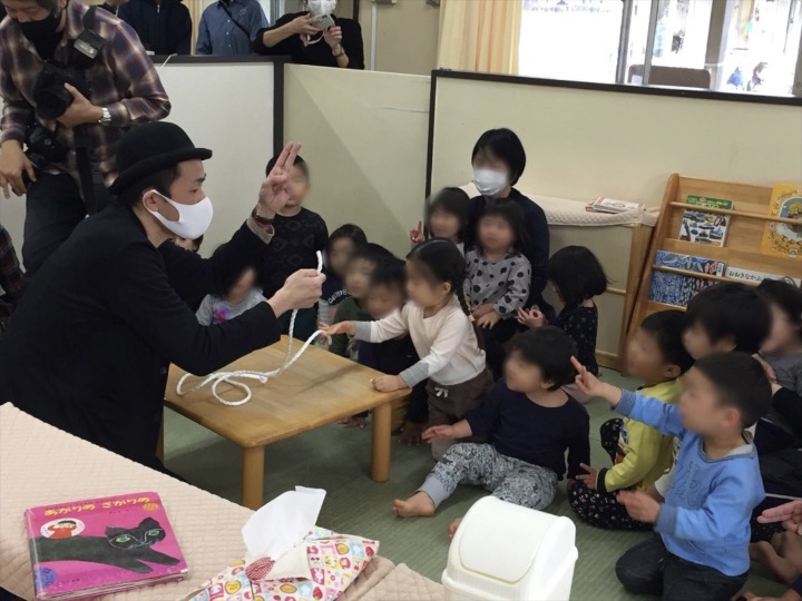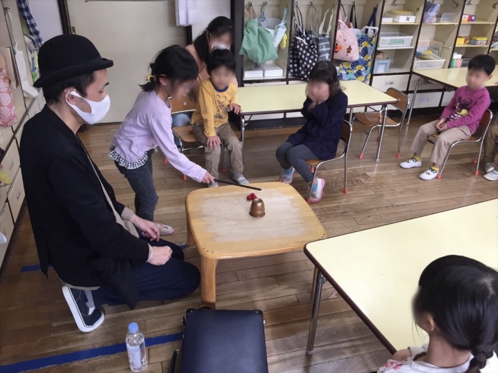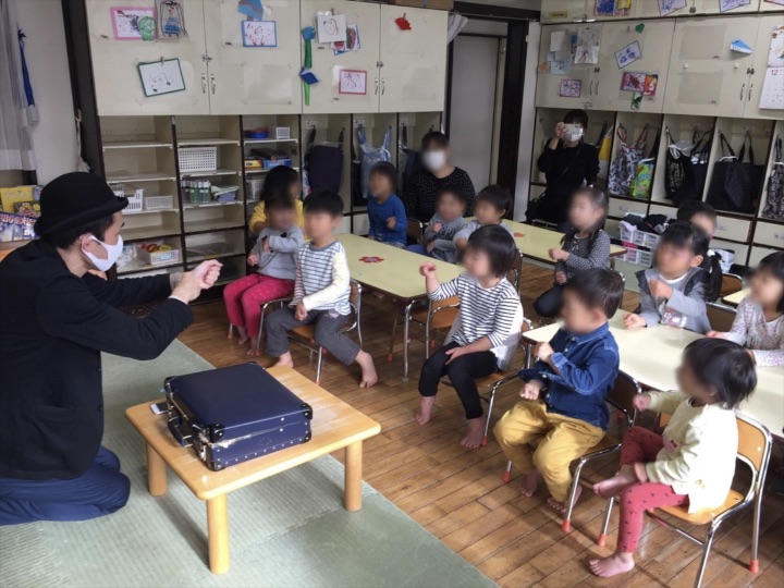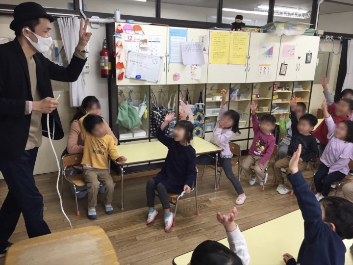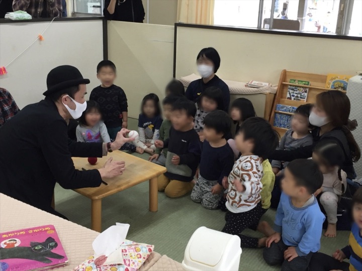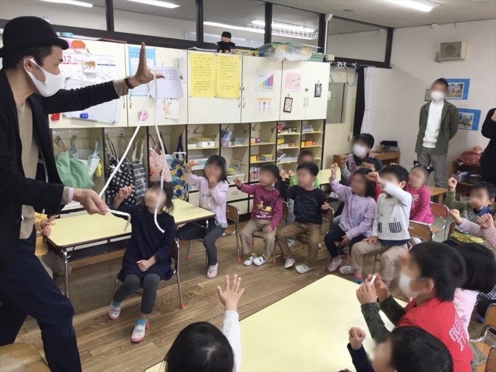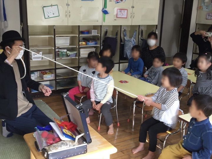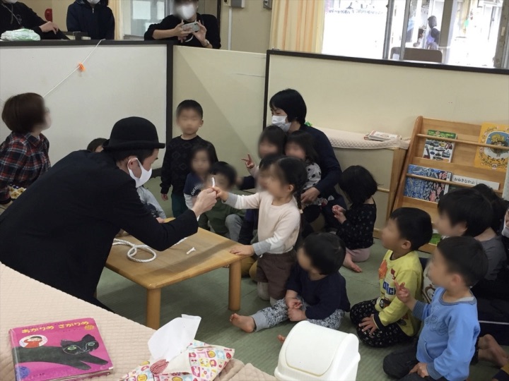 毎年は人形劇のようなのを子どもたちを保育園の一番広い部屋に集めて一度に見ているそうだけど今年は密になるのを避けるために園児たちは自分の教室にいたままでマジシャンが各教室を回ることとなった。