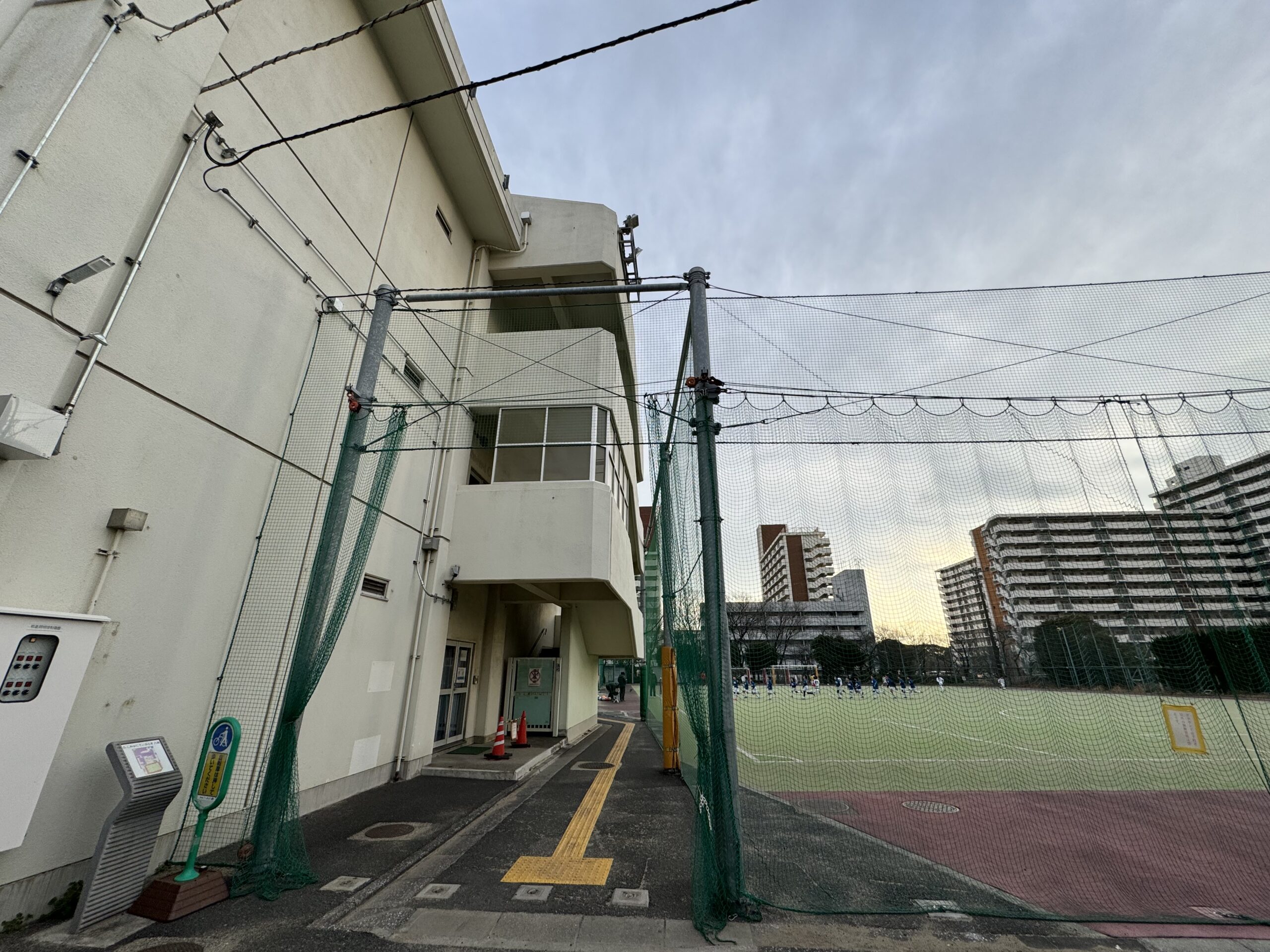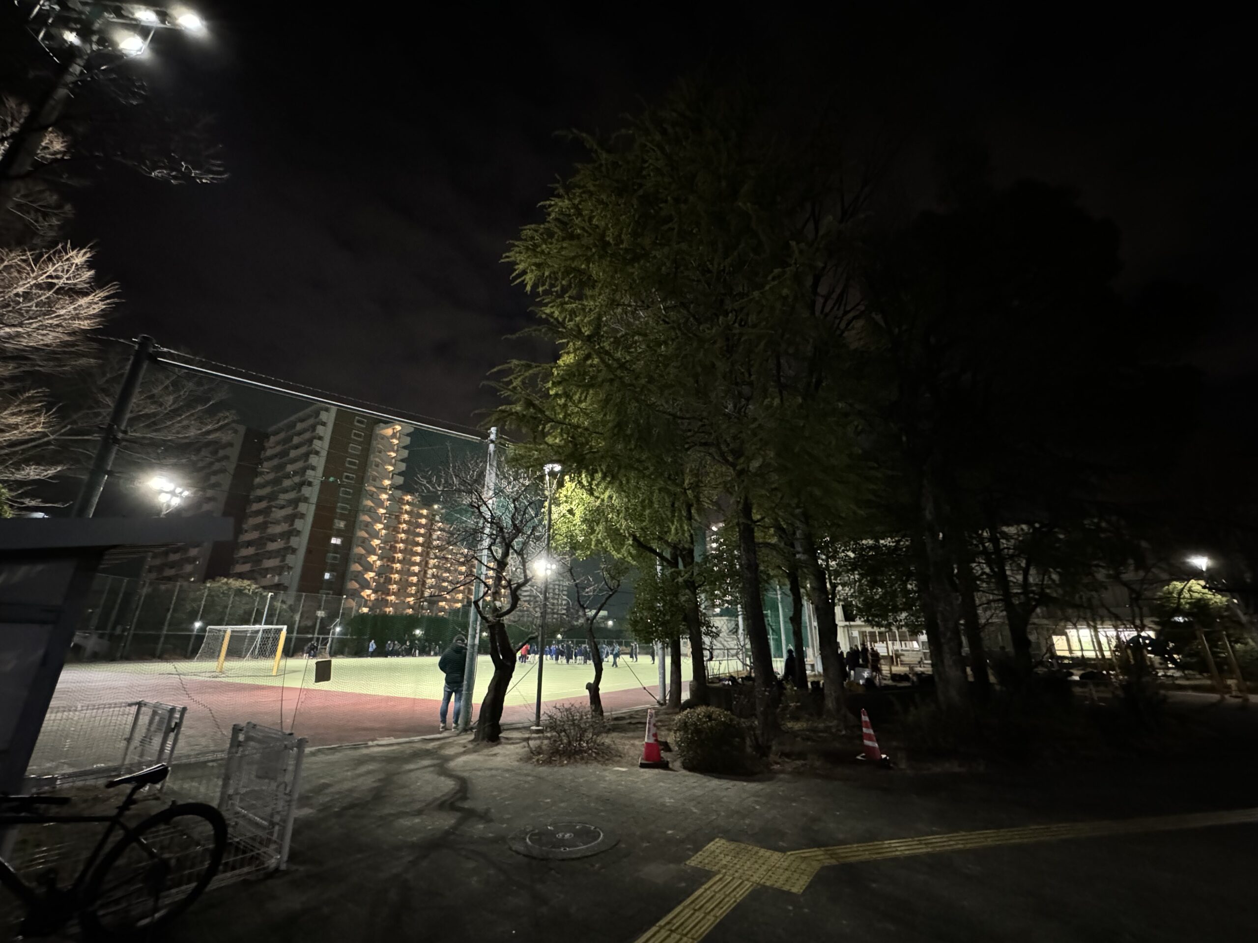 - グランドにはナイター設備が設置してあって子供達がサッカーをやっていた。