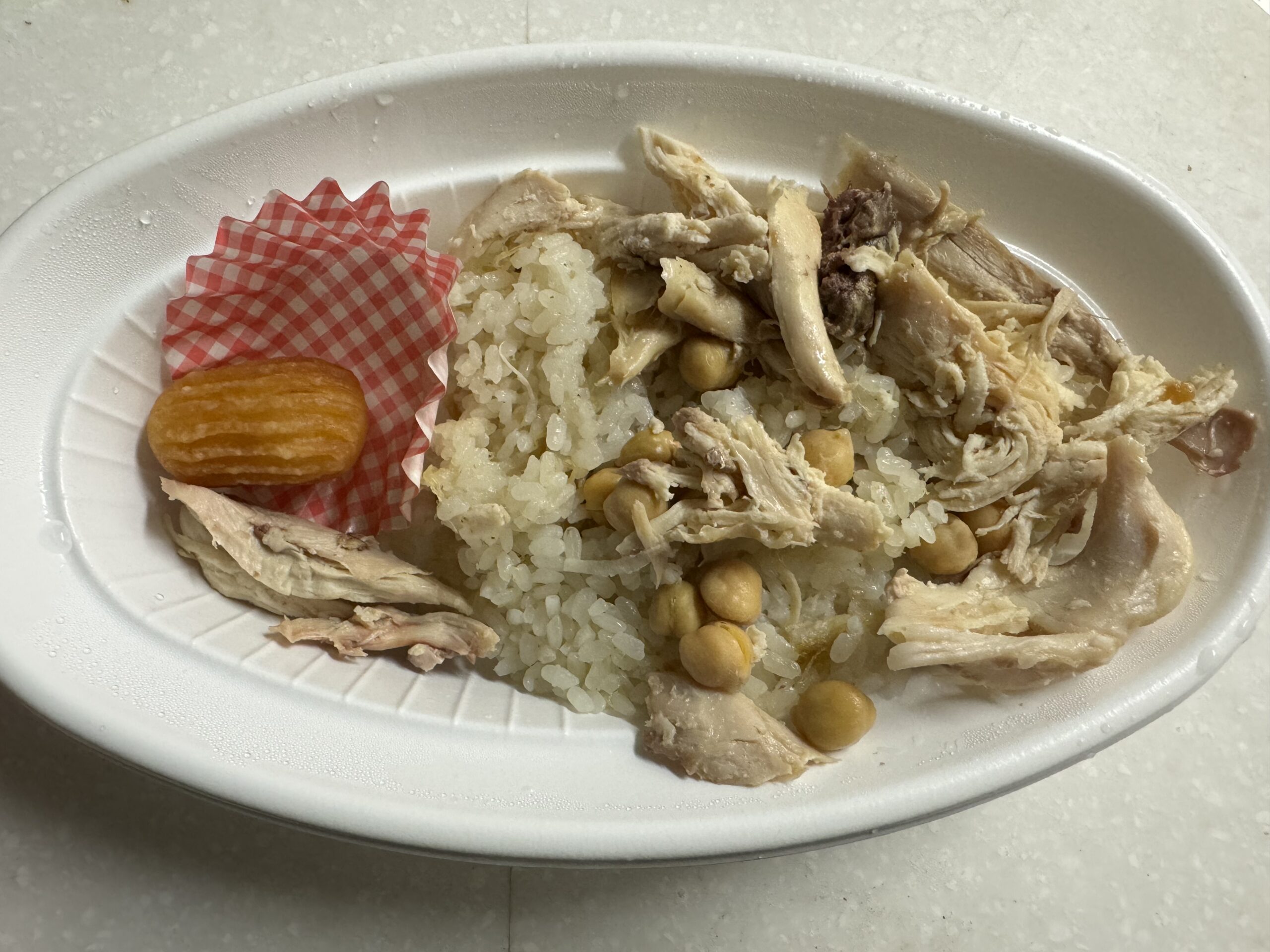 - 帰りにいただいたお弁当。シンプルだけどもとても美味しかった。俵形のは甘いお菓子。